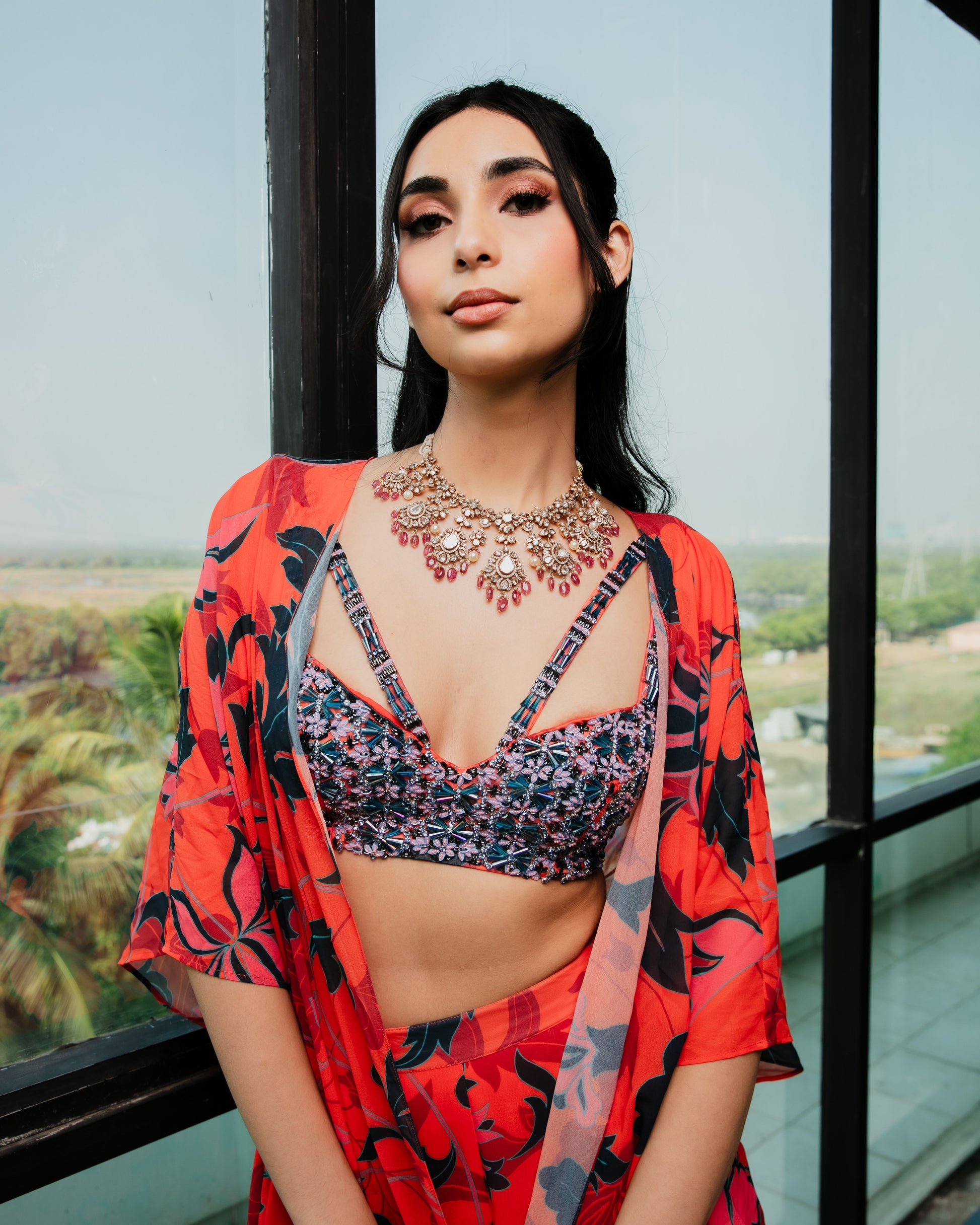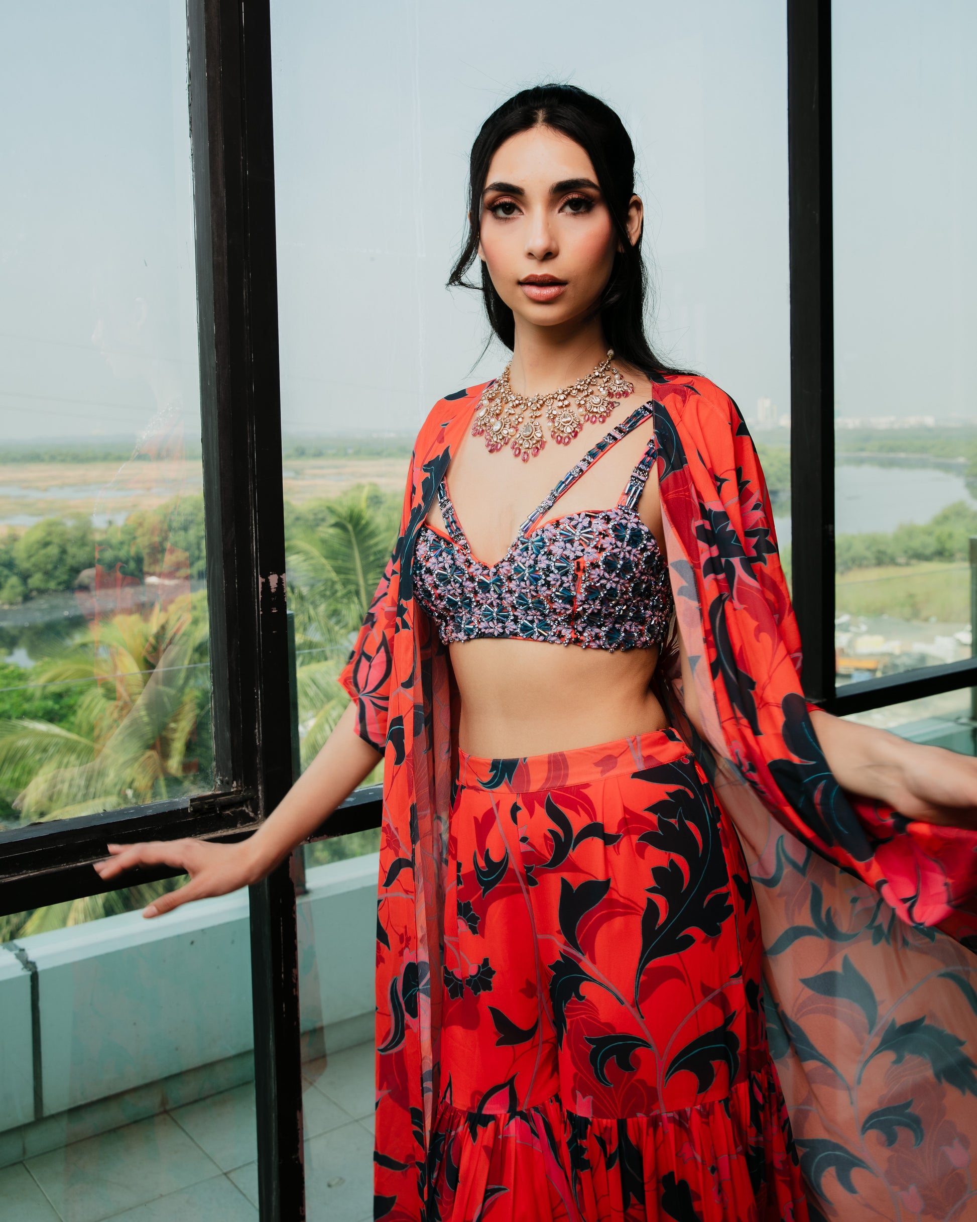 Featuring an embroidered bustier with a printed kaftaan and sharara pants set