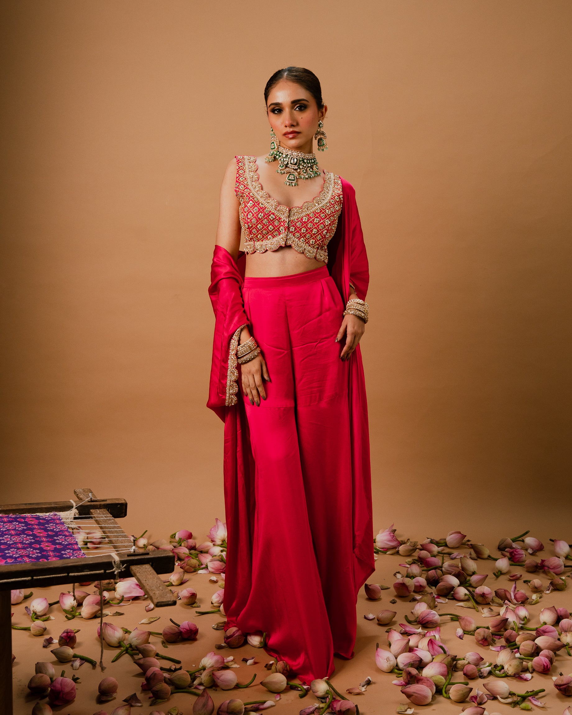 FEATURING A FUSCHIA PINK EMBROIDERED BLOUSE WITH SHARARA PANTS AND A CAPE