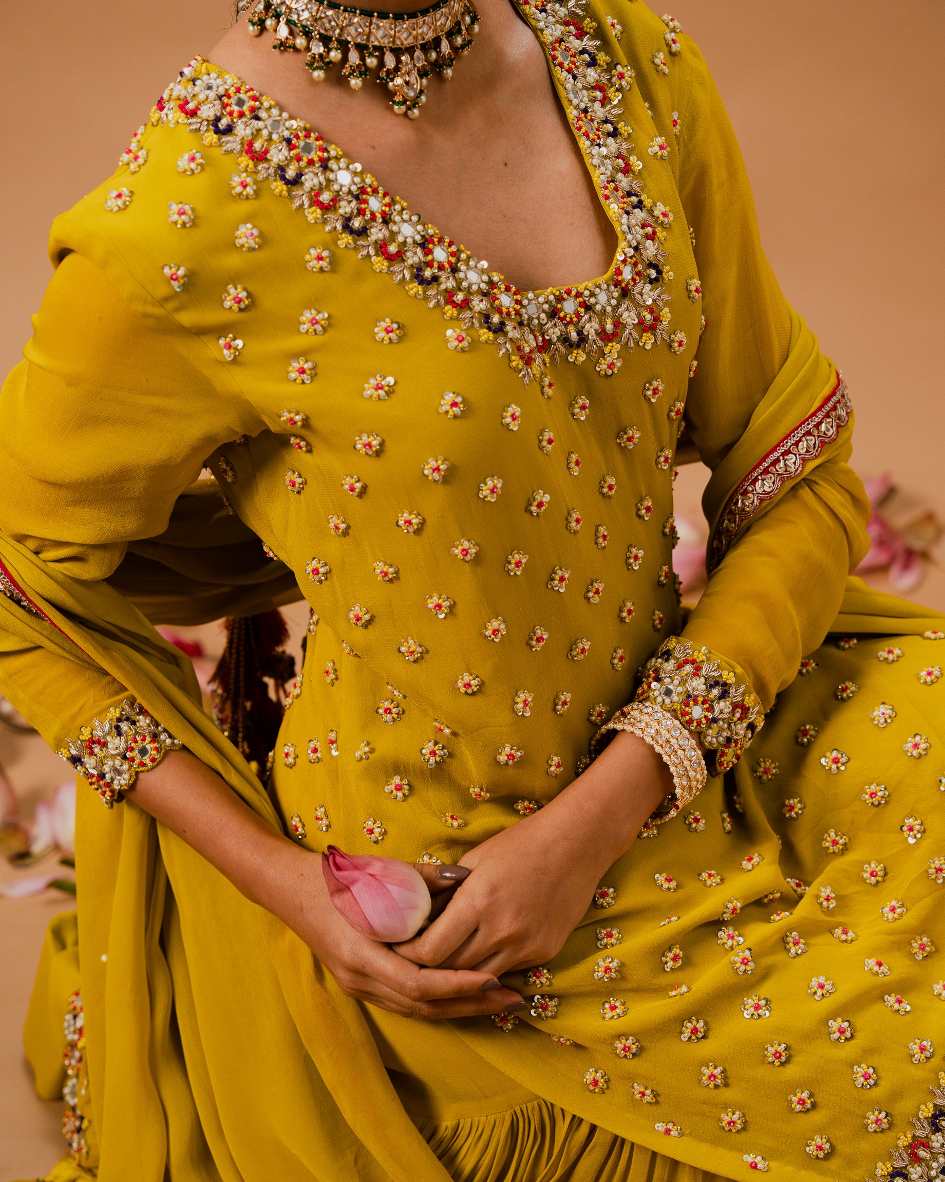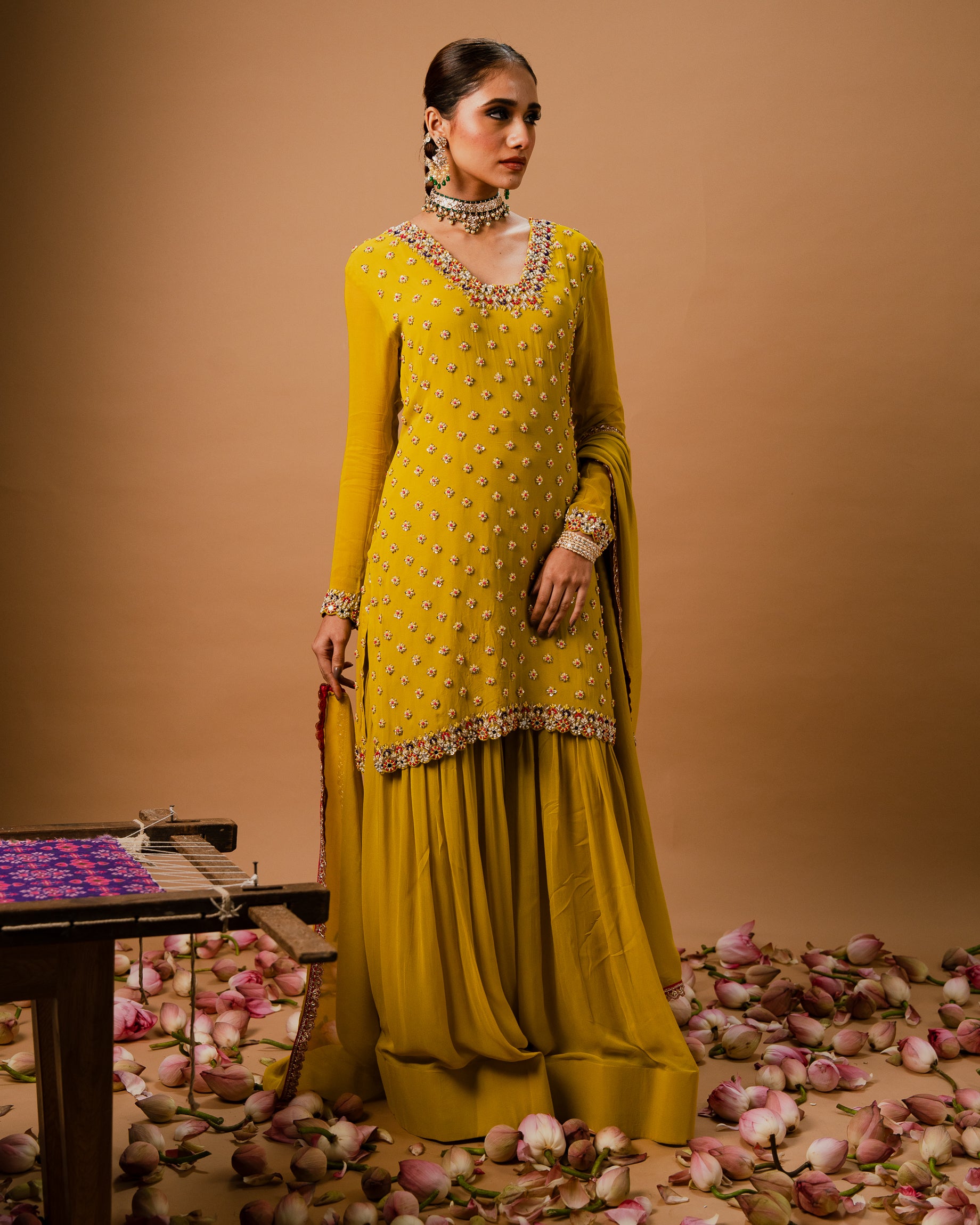 FEATURING A TUSCAN YELLOW EMBROIDERED SHORT KURTA WITH SHARARA PANTS AND A DUPATTA
