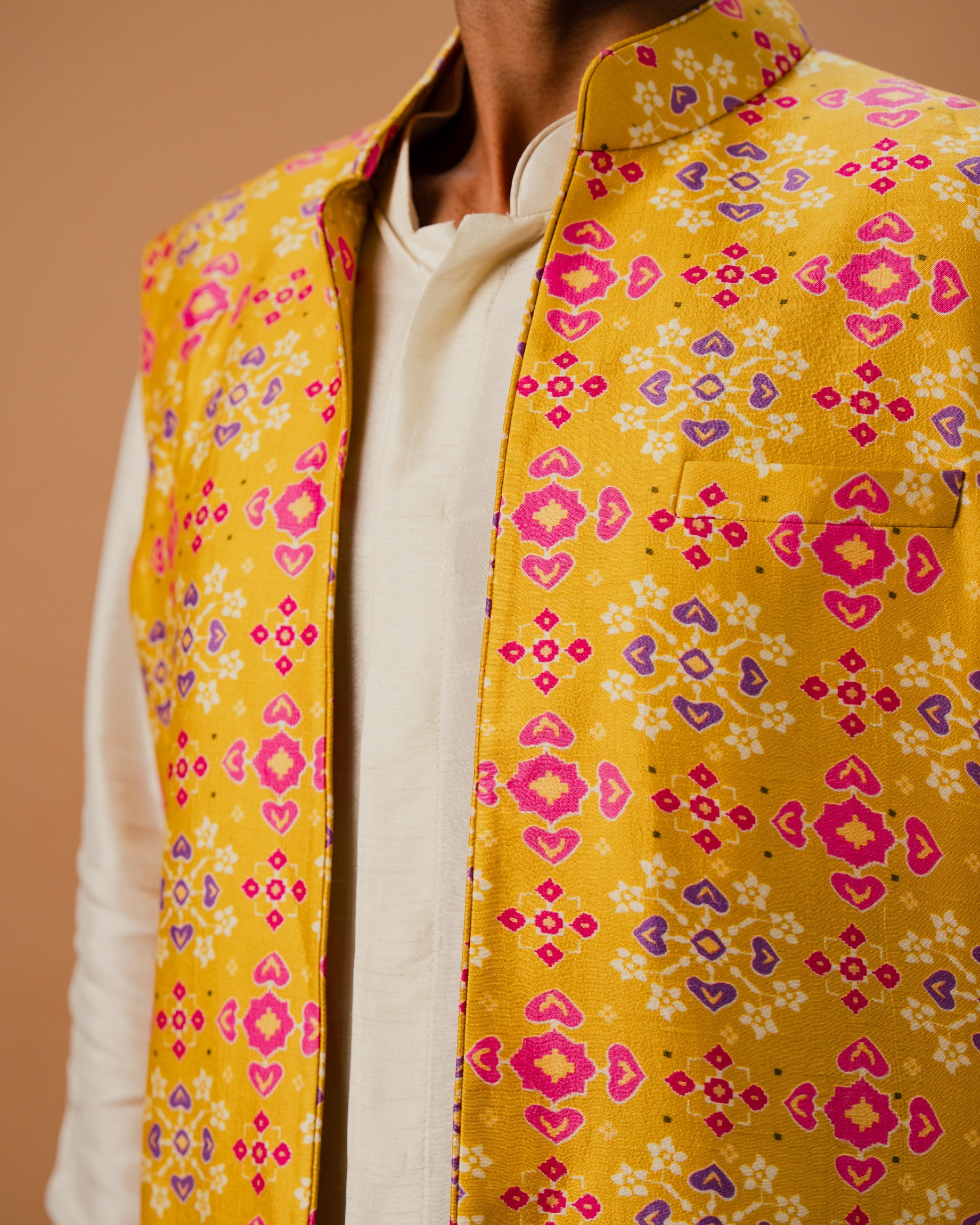 FEATURING AN OPEN PATOLA PRINTED LONG KOTI WITH A LONG DUPION SILK SHIRT AND PANTS