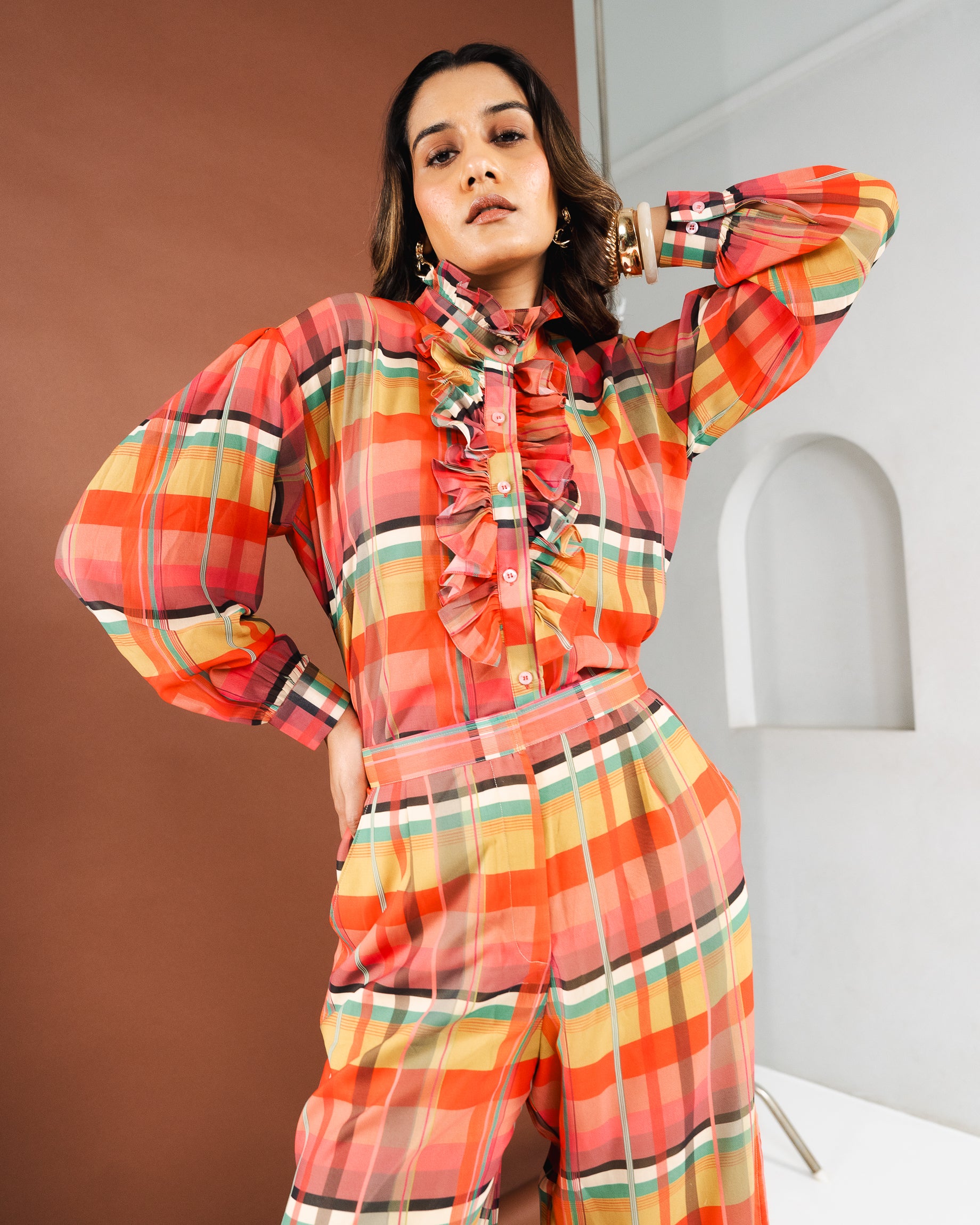 Featuring a multicolour checkered shirt paired with slit wide leg pants