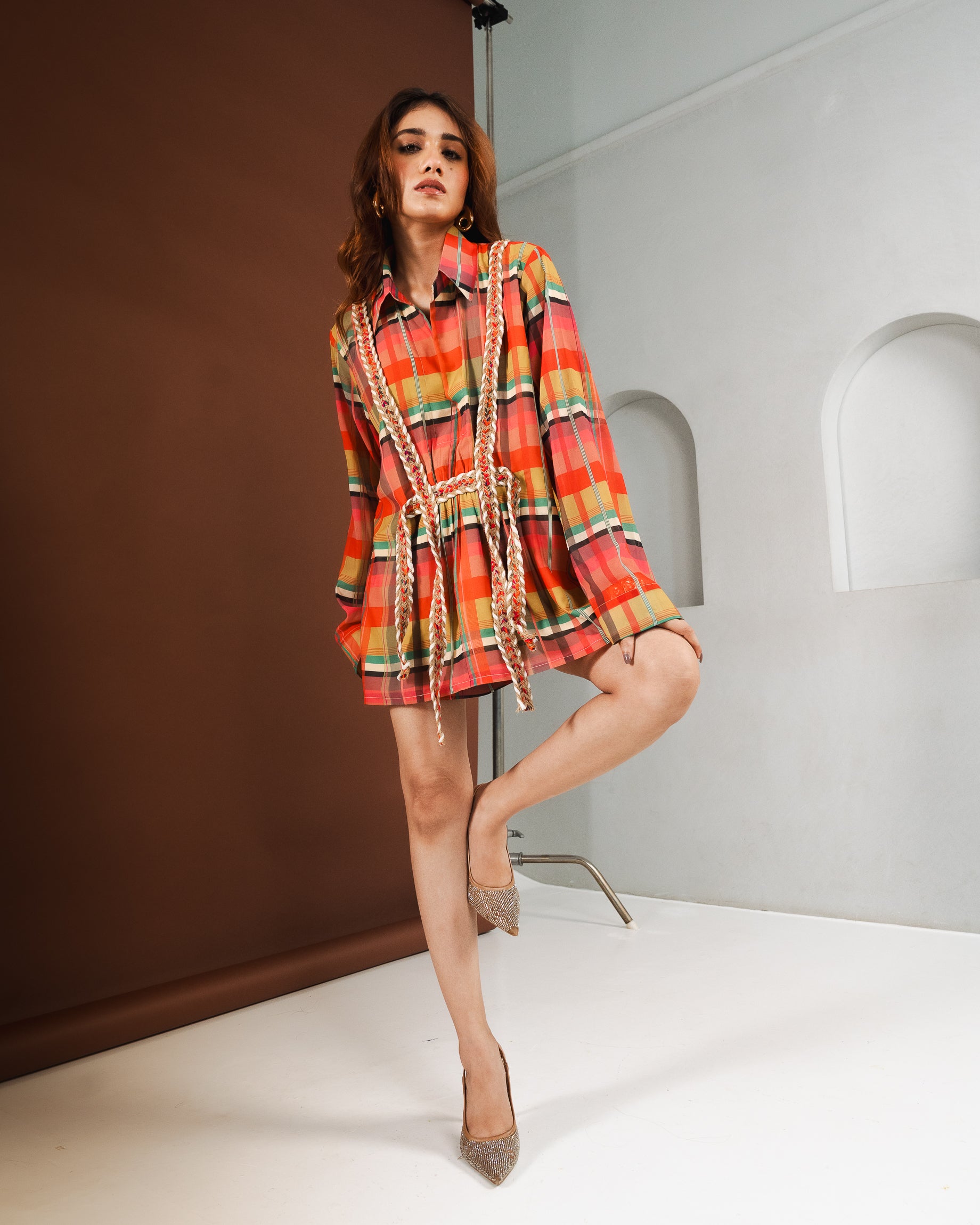 Featuring a multicolour checkered shirt with jute detailing paired with bermuda shorts